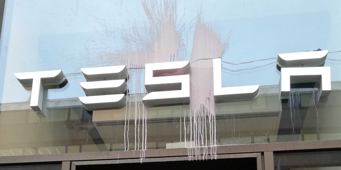 Protesters threw paint bombs against the exterior of the store and also stuck posters with anti-Tesla messages on its walls. One of the posters read “Driving For A Dead Planet” – a jibe at the environmental cost of producing a lithium-ion BEV.