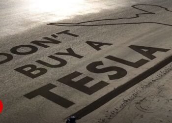 Elon Musk’s notorious “salute” has been carved into sand at the world’s largest Tesla protest. A...