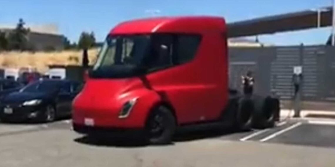 Tesla’s red-colored Class 8 Semi truck has been spotted at a Supercharger in Northern California, backing up into a spot and waiting to be admired. The video, embedded below, was posted by Twitter user @teslacarsonly who was there at the scene, in Dublin, California.