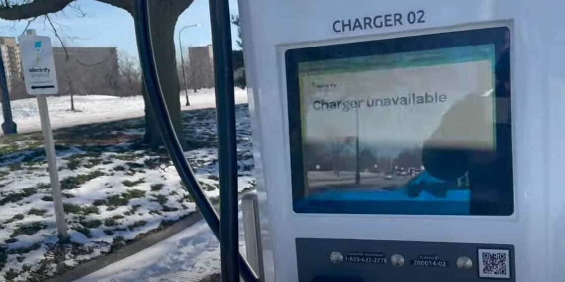 As Kyle points out in the video, even the new Electrify America fast chargers, which were promised to be more reliable than the older units, were failing at a high rate in the frigid Chicago weather. Surprisingly, an older EA unit was functional though. The EVgo sites had issues too, with several of the chargers out of service.