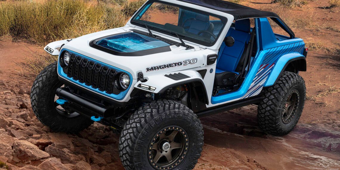 Built from a shortened 2020 Jeep Wrangler Rubicon, the Magneto 1.0 concept debuted in 2021 as an exploration of Jeep’s EV identity, powered by a custom axial-flux motor connected to a 6-speed manual transmission. Initial output was 285 hp and 273 lb-ft of torque, but that increased to 625 hp and 850 lb-ft for the Magneto 2.0 concept that debuted in 2022.