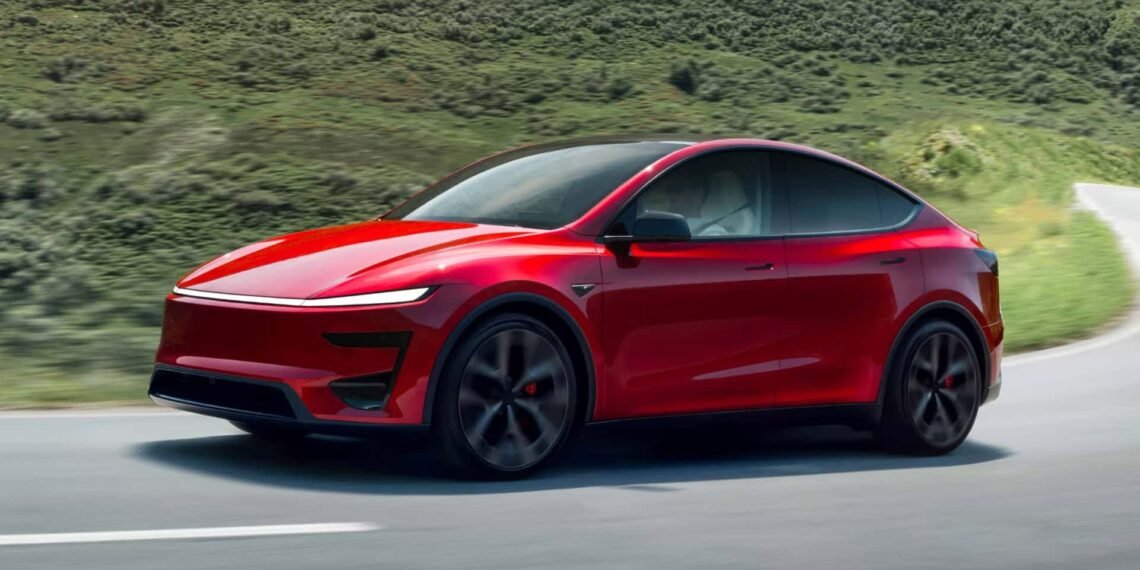 This is the new Tesla Model Y Performance. Revealed today in Europe, the sporty version of the refreshed electric crossover comes with adaptive suspension, multiple driving modes, a higher top speed, faster acceleration, and a bunch of other improvements both inside and out.