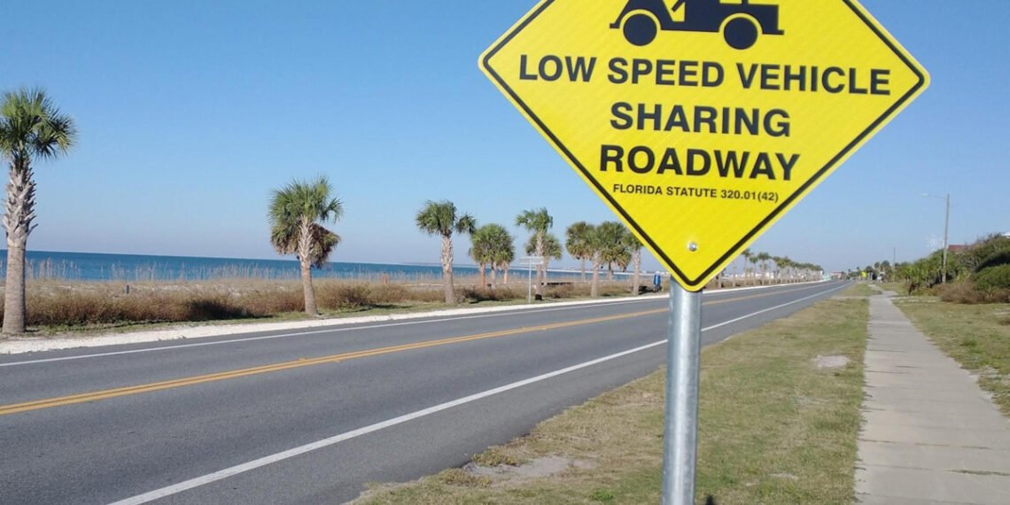 Florida’s Low-Pace Automobile Regulation permits operation on streets with posted pace limits of lower than 35 mph. There are additionally normal tools necessities and the LSVs most pace is capped at 25 mph. Credit score: Anthony Cherolis / CTNewsJunkie