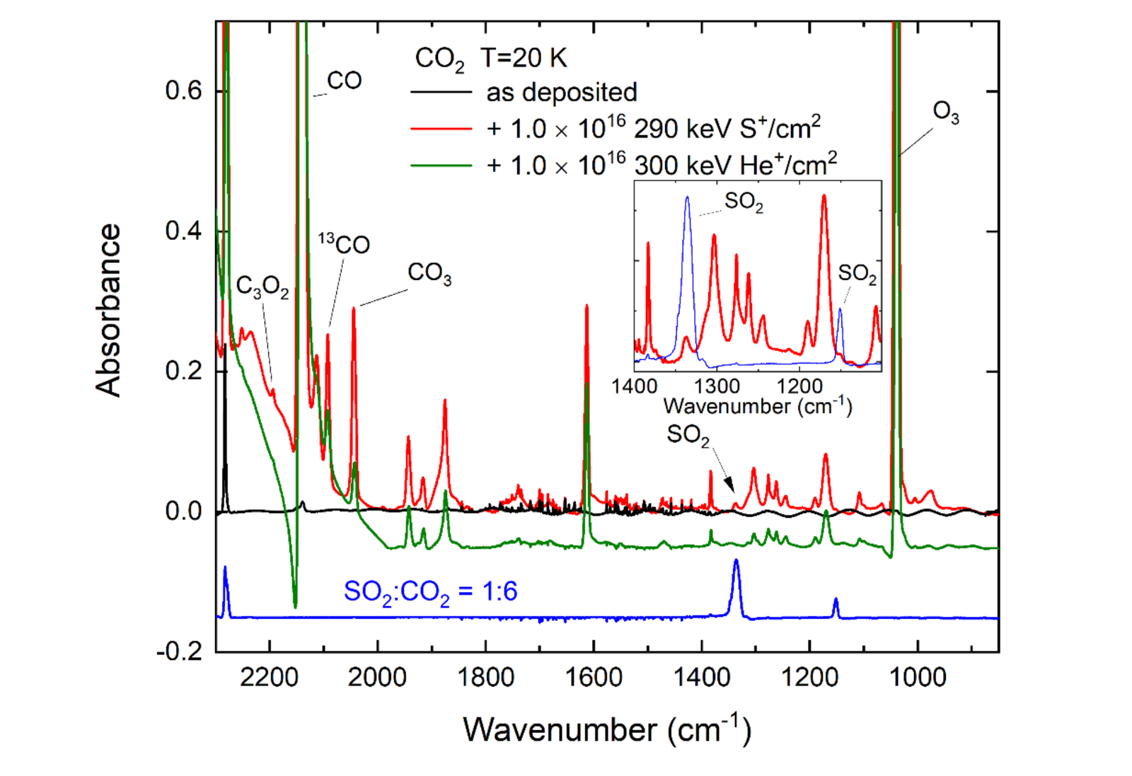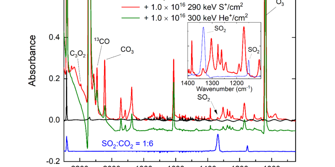 FTIR spectra of condensed CO2 before (black trace) and after (red trace) the implantation of 290 keV S + ions at 20 K. Also shown are the FTIR spectra acquired during control experiments, including an unirradiated CO2:SO2 (6:1) ice mixture at 20 K (blue trace) and a CO2 ice after the implantation of 300 keV He+ ions at 20 K (green trace). The stopping powers of the S+ and He+ ions in the CO2 ice are respectively 4.33 and 9.74 eV Å–1 , while the radiation doses supplied after delivering 1016 ions cm–2 are 325 and 730 eV per CO2 molecule. Note that the spectra of the irradiated ices are difference spectra yielded after the subtraction of the ‘as deposited’ spectra. — astro-ph.EP