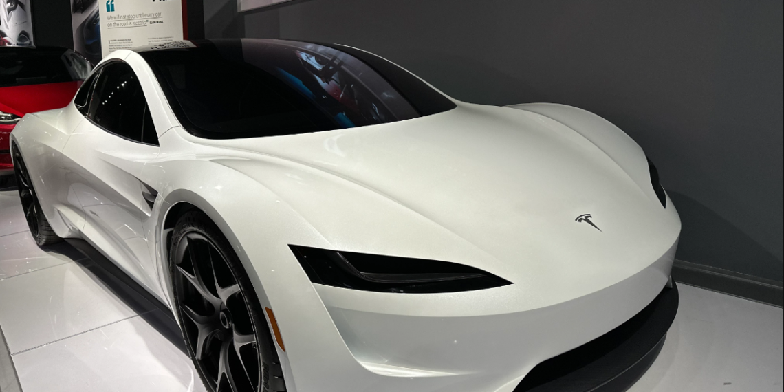 Subsequent-gen Tesla Roadster in white coloration on the Petersen Museum in LA. Credit score: Hansshow Tesla Accessories.