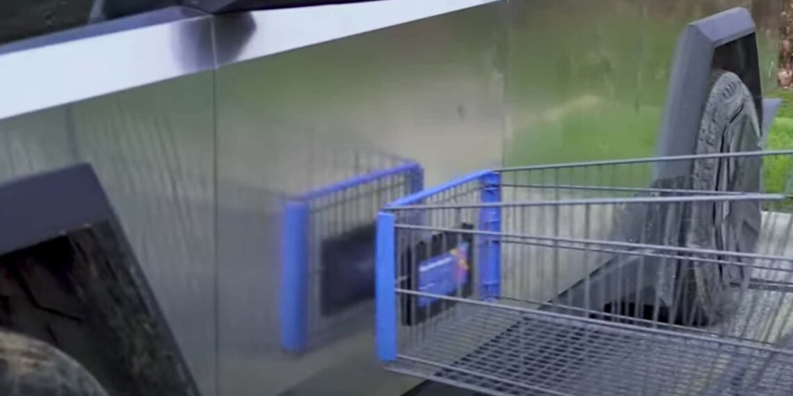 A Tesla Cybertruck goes head-to-head against a shopping cart. Will the cart dent it? What if a person is in the cart and it’s pushed at speed into the Cybertruck?
