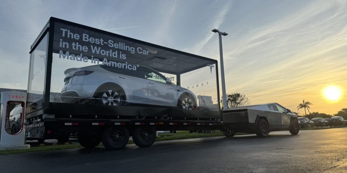 The Cybertruck is pulling a Model Y encased in a glass box with the words “The Best-Selling Car in the World is Made in America” boldly displayed on the side.