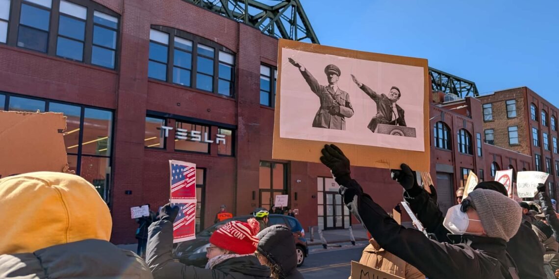 The protest was part of the third straight week of demonstrations at Tesla stores and repair centers around the world, all taking aim at Musk and his increased role in gutting the U.S. government—and in global far-right politics.