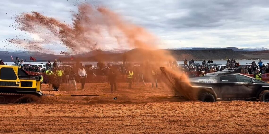 What you will see in the video is a lot of dirt flying. What you won’t see is either vehicle completely dominate. The traction is just not there for one to quickly tug the other. However, the results are basically this—the Bombardier’s tracks dig holes into the ground, but the vehicle doesn’t move much, whereas the Cybertruck remains mostly stationary and throws a lot of dirt into the air from its rear tires.