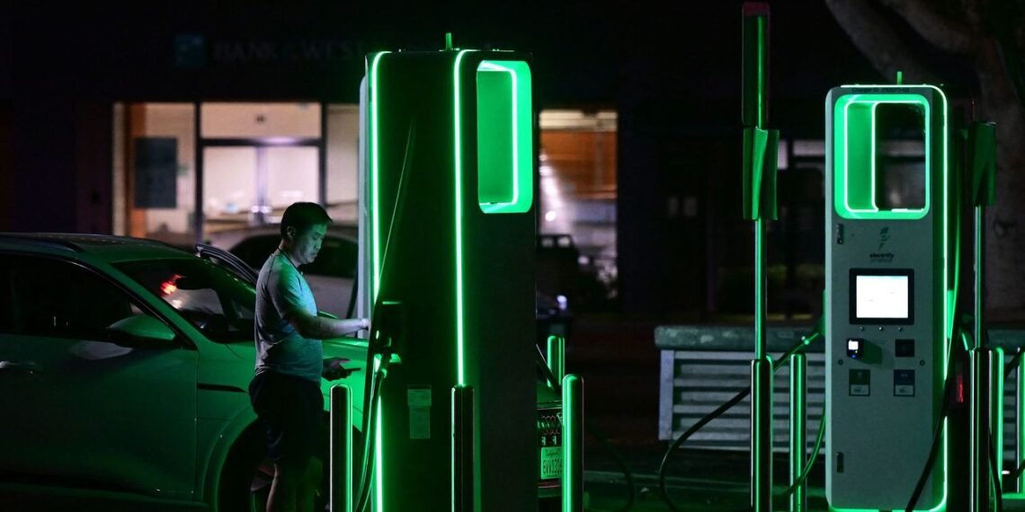 The U.S. has simply 11,600 factors the place any EV can cost shortly, in keeping with the analysis group Atlas Public Coverage. FREDERIC J. BROWN/Agence France-Presse/Getty Photographs